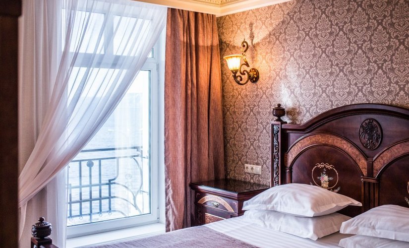 Номера обставлены шикарной итальянской мебелью, выполненной из массива дерева.