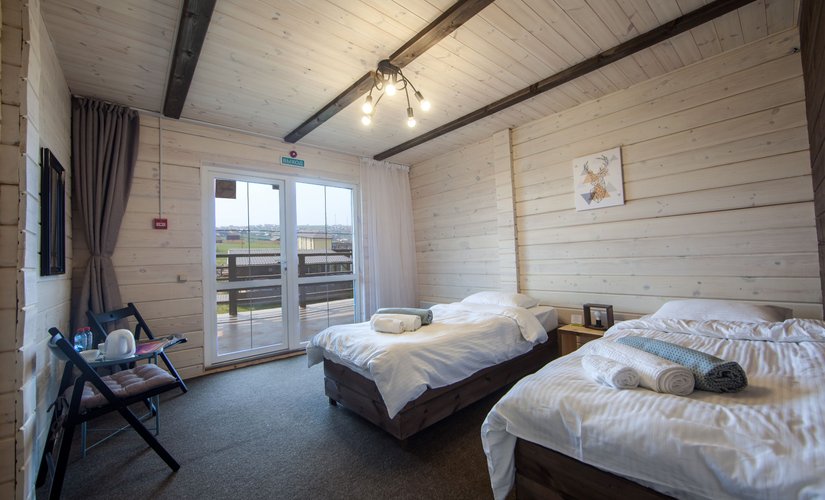 Делюкс номер с видом на Байкал, площадью 18 кв.м. В номере имеются две box-кровати, своя ванная комната с туалетом и душевой кабиной. Есть всё необходимое для чаепития. В ванной есть фен, полотенца для гостей и туалетно-косметические принадлежности.