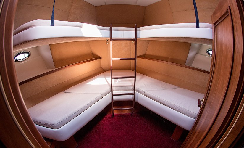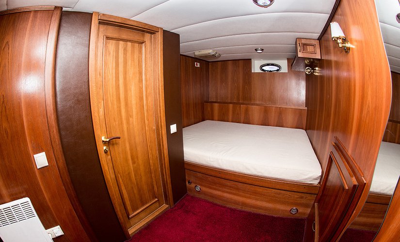В носовой части судна расположены 3 гостевые каюты: 4-х местная, 3-х местная и одна с 1,5(1+1)спальной кроватью. В кормовой части расположена каюта с 2-х спальной и односпальной кроватями.