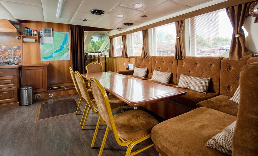 В кают-компании мягкий диван, стулья и обеденный стол, плазменный телевизор, DVD, проигрыватель с USB входом.