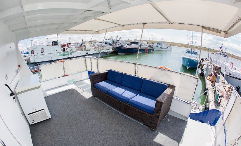В надстройке так же расположен камбуз, кают компания и пост управления судном. На открытой палубе находится большой мягкий диван. Около 60% площади надстройки занимает остекление, в ходе путешествия вы можете наслаждаться потрясающими видами Байкала.
